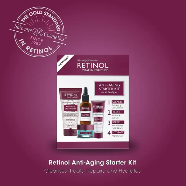 Whether you are a first-time user of Skincare L de L Cosmetics® Retinol or need a convenient set for travel, our Anti-Aging Starter Kit is the perfect solution for you. The Anti-Aging Starter Kit contains smaller versions of 4 of our skincare products to help you become familiar with our Retinol-based skin care line.